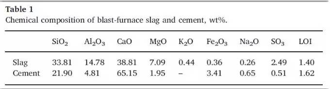 試驗(yàn)主要選用某鋼鐵公司所產(chǎn)的玻璃質(zhì)磨粒高爐礦渣和P.I 42.5硅酸鹽水泥。采用X-ray技術(shù)X射線熒光來測(cè)定礦渣和水泥的主要化學(xué)成分,具體可見下表。