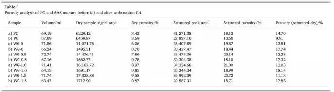 可以看出,在碳化前后,PC和AAS的體積、干樣品信號(hào)和孔隙率存在較大差異。結(jié)果表明,碳化過程對(duì)所有試樣的收縮效應(yīng),但PC試樣的收縮率較低。這主要與Ca(OH)2膨脹轉(zhuǎn)化為CaCO3有關(guān),有研究表明,碳酸鈣的形成使體積增加了11.8%。另一方面,當(dāng)采用0、0.5、1、1.5三種模量時(shí),水玻璃模量的增加使收縮率分別提高了7.43%、7.67%、9.98%和11.53%。這可能是由于隨著水玻璃模數(shù)的增加,C-S-H的形成阻礙了碳酸鈣的結(jié)晶。此外,碳化過程中水滑石的形成也可能對(duì)碳酸鈣結(jié)晶產(chǎn)生干擾作用。