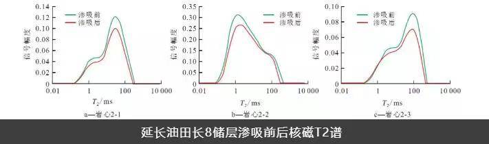 由滲吸前后核磁共振T2譜可以看出,在巖心樣品處于原始含油飽和度狀態(tài)時,含油孔隙半徑分布表現(xiàn)為2個峰,左峰表示小孔隙部分,右峰表示大孔隙部分。自發(fā)滲吸實驗后,左、右峰幅度比原始含油飽和度條件下測得的幅度均有減小,表明致密油儲層的孔隙半徑很小,而毛管壓力作用很大,具有較強的毛管滲吸作用,即巖心樣品小孔隙中的原油因毛管壓力作用吸入水而排出油,因此利用毛管壓力的滲吸作用,吸入水、排出油,對提高致密油儲層的采收率具有重要意義。